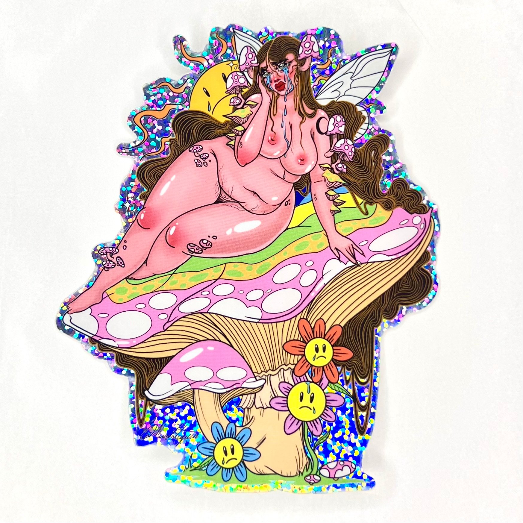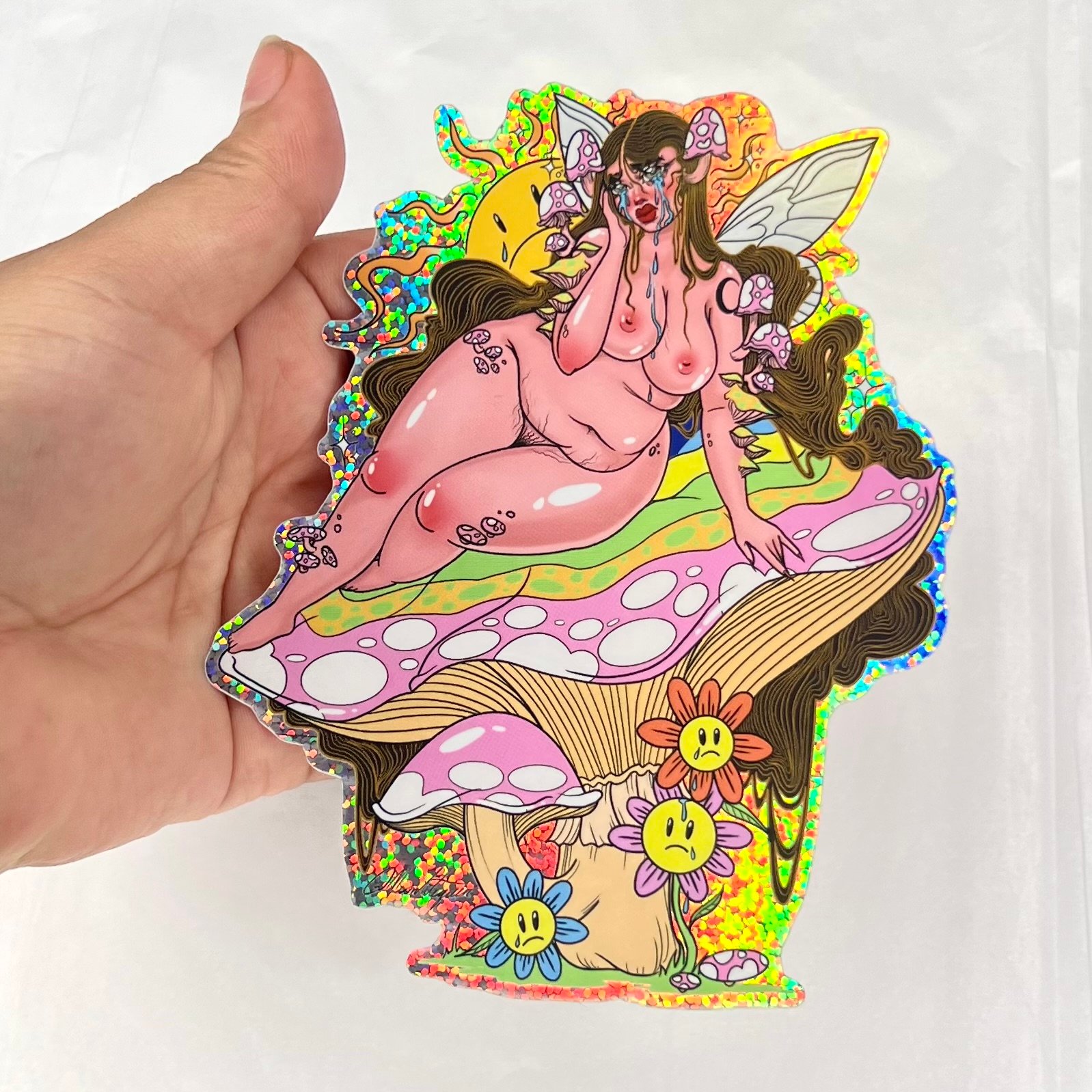 A happy day jumbo holographic glitter sticker. 4.1 x 5 inches. All of my stickers are weatherproof, water proof and scratch proof.