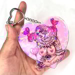 The original cow babe design centered into an acrylic charm added to a heart ring keychain. Coated with a holographic layer and one of my largest keychains. Added a clip clasp which can be use to put on a bag instead.